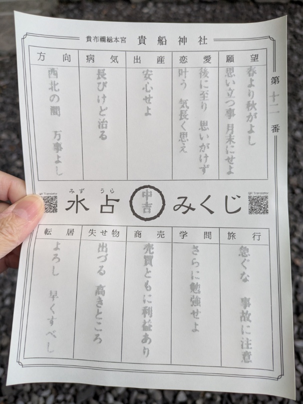 貴船神社の「水占みくじ」は白紙のおみくじを水に浮かべると文字が浮かび上がる珍しいおみくじです。早速、私も引かせていただきました、「中吉」という可も無く不可も無くという結果でした。