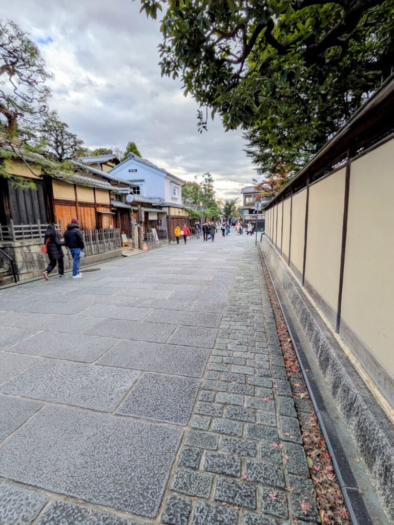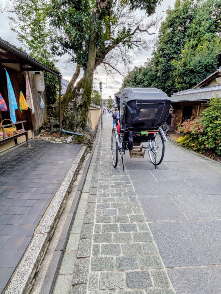 道の両脇には歴史を感じさせる建物が立ち並び、着物姿の観光客や人力車が行き交う様子は、京都らしい風情に満ちています。