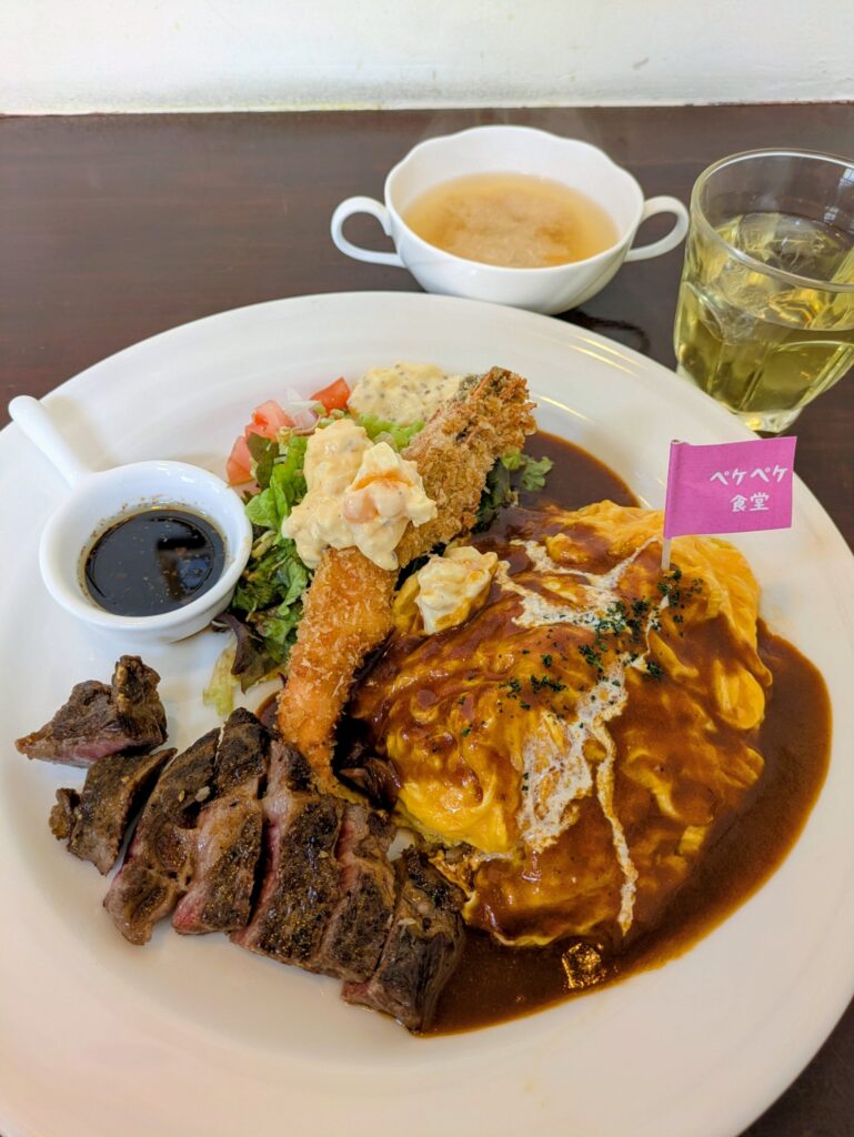 今回はオムライスとエビフライとお肉とポテサラがセットになった「ペケペケランチ」をいただきました。